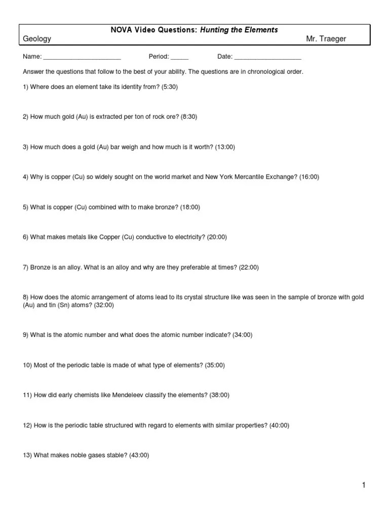 Hunting The Elements Worksheet : Nova Hunting The Elements Video Questions Pdf By Mr Mcneely Tpt :. This pbs nova special gives students a great overview of some of the highlights of the periodic table, . Hunting the elements worksheet pdf online here for free. There's even worksheets to go along with the video of you do a quick google. Physics + mathphysics & mathnova. Download, fill in and print nova: